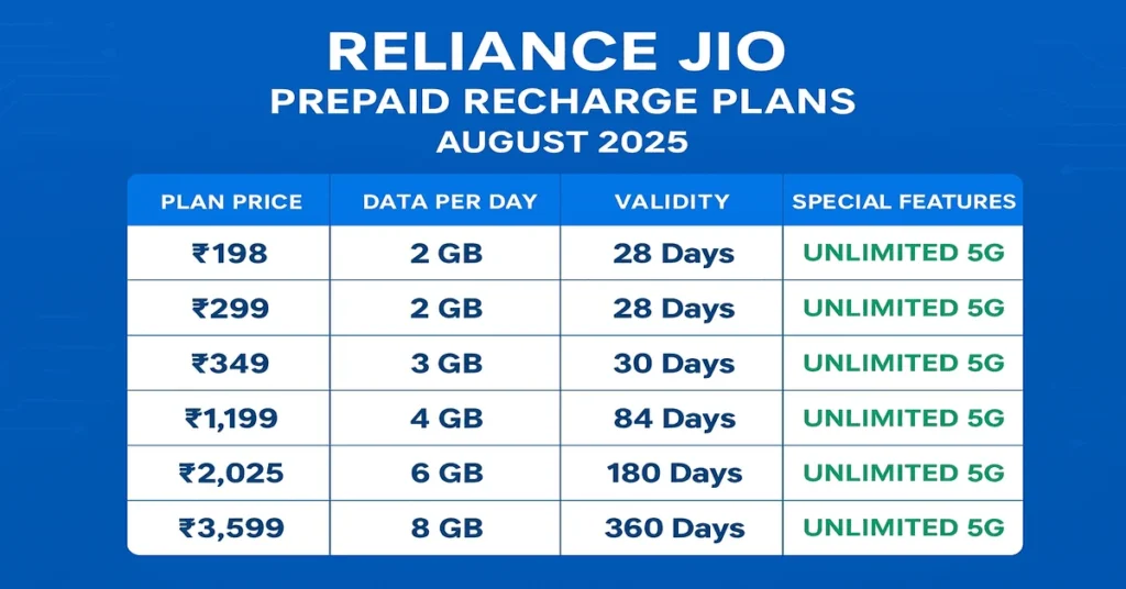 2 Min Read Mr BrandionAugust 19, 2025 Jio Recharge Plan: Latest Prepaid Updates August 2025 Reliance Jio has updated its prepaid recharge plans in August 2025, affecting subscribers across India. The telecom company has discontinued…